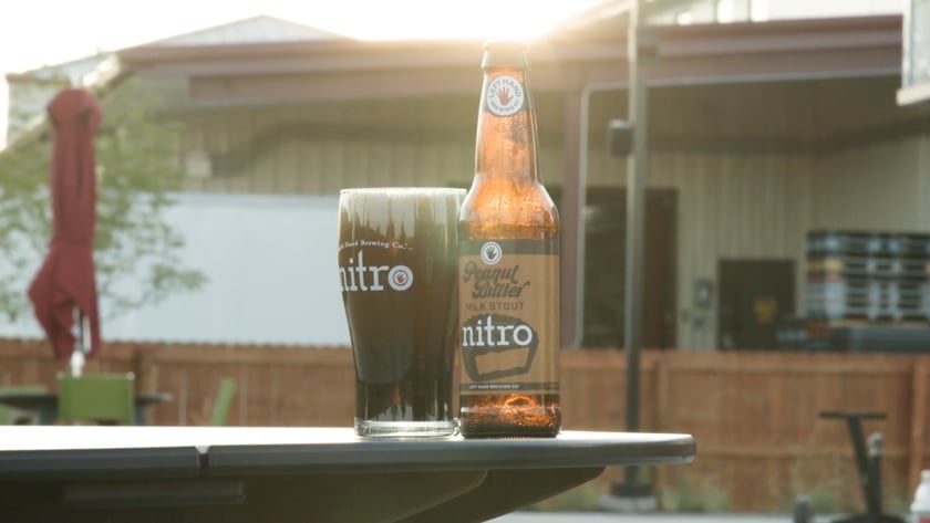 Create a video that introduces Left Hand Brewing’s new release, Peanut Butter Milk Stout Nitro, showcasing the beer’s unique blend of creamy peanut butter and rich milk stout, and providing a look at the brewery’s new beer garden.